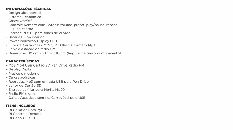 Para Mp3, Mp4, Mp5 e Pen drive, Cartão SD. e também compatível com diversos aparelhos com entrada USB. Alem de ser possível transformar a super caixa em um mini system utilizando um Pen Drive.